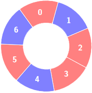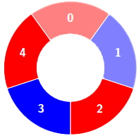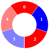 빨간색과 파란색 타일로 이루어진 원형 배열이 있습니다.