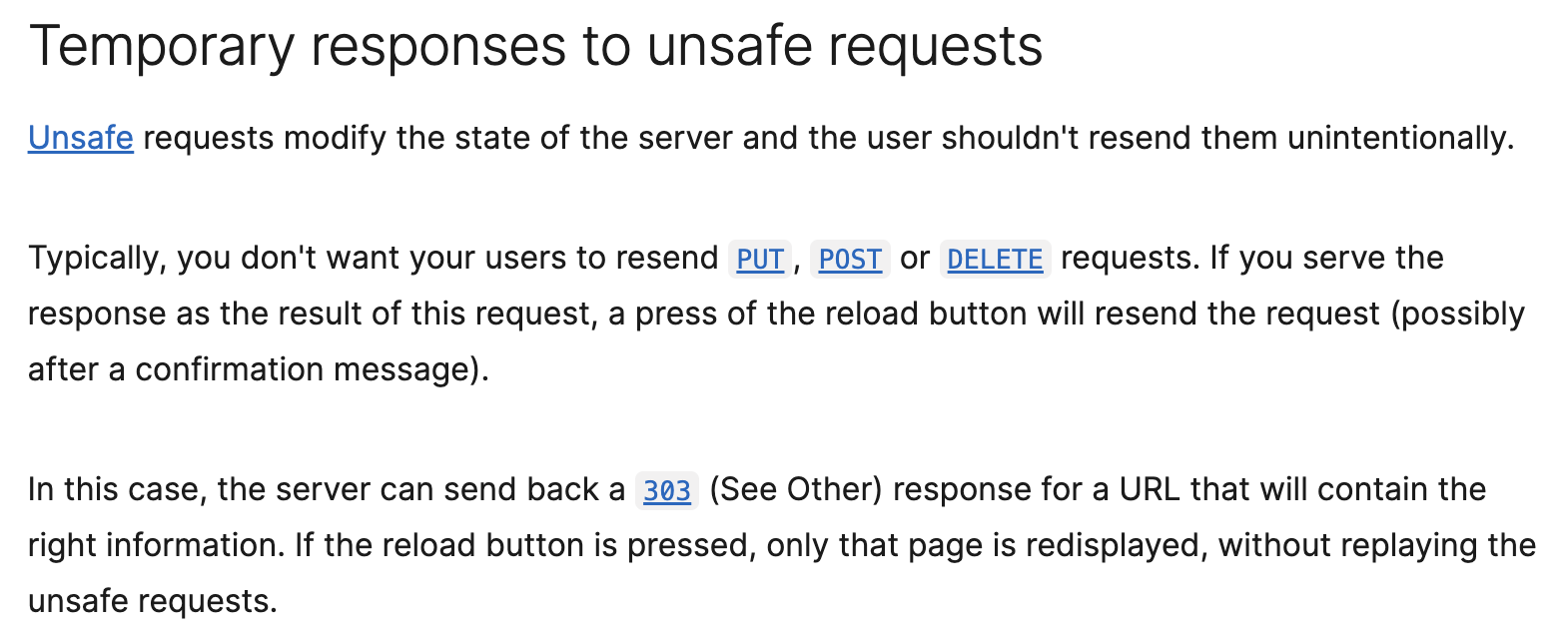 그런데 POST는 멱등하지 않은 메소드입니다. 이때 웹 브라우저에서 새로고침은 마지막에 서버에 전송한 데이터를 다시 전송하게 되므로 글 작성, 결제와 같은 POST 요청들이 여러 번 요청되게 되면 심각한 문제가 발생할 수 있습니다.