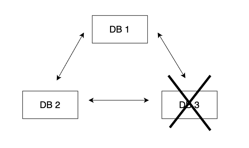 DB 1, DB 2, DB 3가 있을 때 DB 3에서 장애가 발생한 상황을 나타낸 그림입니다. 이런 상황에서는 DB 3는 DB 1과 DB 2의 데이터 복제본을 받지 못합니다. 또한 DB 3에 저장되어 있지만 DB 1, DB 2에 전달하지 못한 데이터가 있을 수도 있습니다. 이런 상황에서 만약 일관성을 택하게 된다면 데이터 불일치 문제를 피하기 위해 다른 DB 1, DB 2에도 쓰기 작업을 중단해야 합니다. 이는 가용성을 해치게 됩니다. 그렇다고 가용성을 택하게 된다면 DB 1,2와 DB 3의 일관성을 해치게 됩니다. 그렇기에 일관성과 가용성 중 하나는 포기해야 합니다.