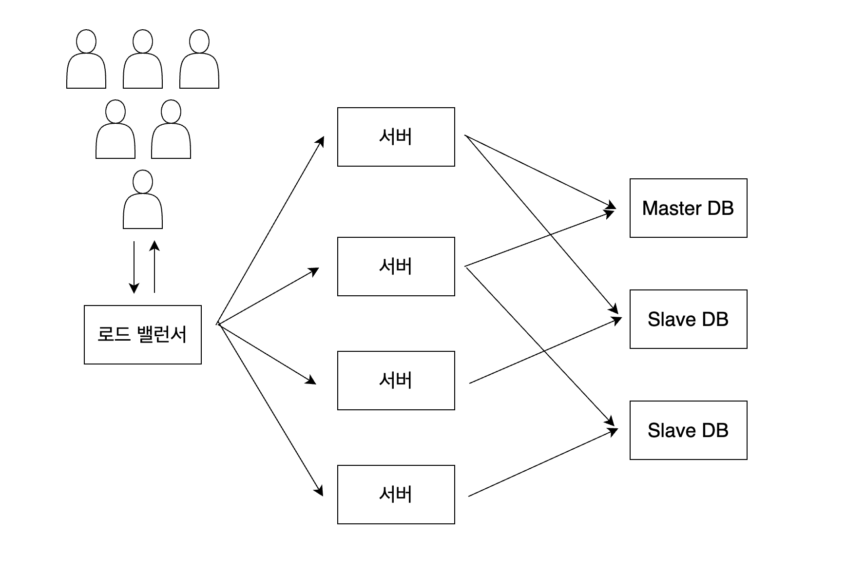 로드 밸런싱을 통해 서버는 SPOF를 방지했지만 여전히 DB는 SPOF 지점으로 남아있습니다. 하지만 서버와 달리 DB는 개수만 늘린다고 끝나지 않습니다. DB의 개수를 늘려도 각 DB가 서로 다른 데이터를 가지고 있으면 안 되기 때문입니다. 그렇기에 Replication이 필요합니다. DB끼리 데이터를 복사해 동일한 데이터를 가지고 있도록 하는 방법입니다. 복제 방식에는 여러 방식이 존재하지만 보통은 Master - Slave 관계를 설정하여 Master DB에만 쓰기가 가능하도록 하고 Master DB의 데이터를 여러 Slave DB에 복제한 뒤 Slave DB의 데이터를 읽는 방식을 사용합니다. 만약 Slave DB 중 1대에 장애가 발생하면 다른 Slave DB에서 데이터를 읽으면 됩니다. 만약 Master DB에 장애가 발생하면 Slave DB 중 하나를 Master DB로 승격시킨 뒤 사용하면 됩니다. 이렇게 DB도 다중화하여 SPOF를 방지할 수 있습니다. 이런 식으로 각 구성 요소들의 다중화를 통해 SPOF를 방지하는 것이 장애 허용성(Fault Tolerance)입니다.