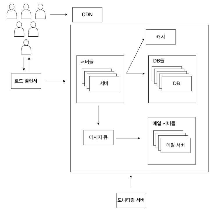 만약 복잡한 것이 싫다면 이런 상황에서 서버의 성능을 올리는 것으로 간단하게 해결할 수 있습니다. 더 좋은 CPU나 RAM을 가진 서버로 업그레이드를 하면 더 많은 트래픽을 처리할 수 있습니다. 이를 Scale Up이라고 부릅니다. 하지만 이 방법은 결국 한계점이 존재합니다. 아무리 좋은 서버여도 그 한계가 존재하기 때문입니다. 또한 위의 설계에서 서버와 DB 중 1곳에서만 장애가 발생해도 전체 서비스가 중단되게 됩니다. 이렇게 시스템의 구성 요소 중 한 곳에서 장애가 발생하면 전체 시스템이 중단되는 지점을 SPOF라고 부릅니다. 개발자는 이런 SPOF를 방지하기 위한 시스템을 설계해야 합니다.