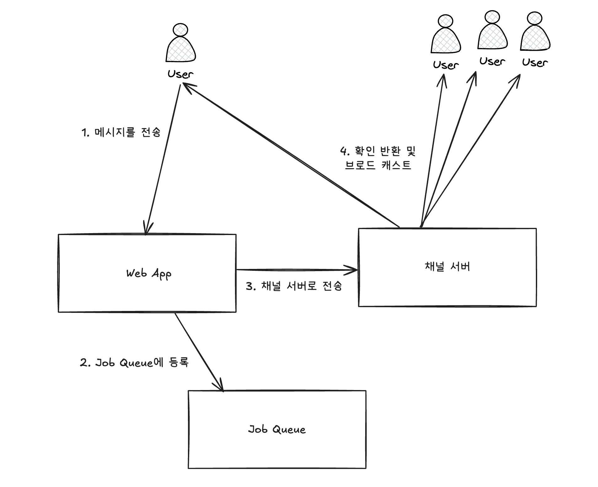 Slack은 위 문제를 해결하기 위해 사용자의 메시지를 채널 서버가 아닌 Web App에 전송되도록 바꿨습니다. 사용자의 메시지를 Web App에 전송하면 Web App은 해당 메시지를 Job Queue에 기록합니다.(이 과정에서 영속화, 색인화, 파싱 등이 수행됩니다.) 그 후 Web App이 채널 서버를 호출하여 메시지를 실시간으로 브로드캐스트 합니다.