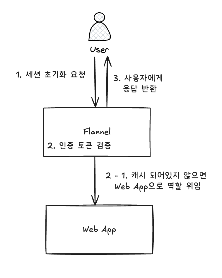 그 결과 사용자의 요청이 오게 되면 클라이언트는 Flannel에 연결됩니다. 이때 사용자는 인증 토큰을 전달하고 Flannel은 해당 토큰을 검증하고 필요 시에는 Web App에 위임합니다. 만약 해당 팀의 최신 정보를 이미 캐시로 보관 중이라면 Web App까지 요청을 전달할 필요없이 Flannel에서 응답을 반환합니다.