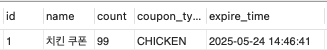 쿠폰 테이블은 타입과 쿠폰의 이름, 쿠폰 발급 가능 갯수와 만료 기한을 컬럼으로 가지고 있습니다.