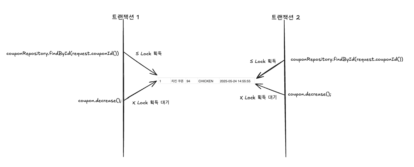 이때 메소드에 @Transactional이 있기 때문에 아직 트랜잭션이 끝나지 않아 해당 couponId의 레코드에 S Lock이 걸리게 됩니다. 그 뒤 해당 쿠폰의 갯수를 차감하기 위한 update로직이 있습니다.