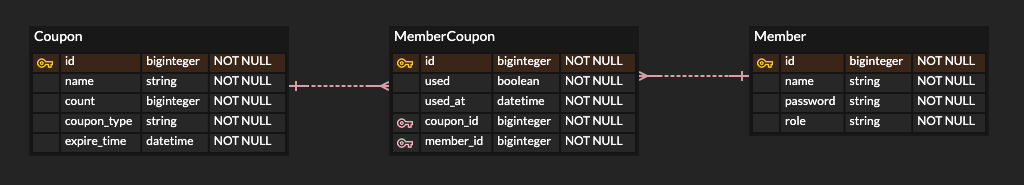 멤버 쿠폰은 사용자에게 발급된 쿠폰을 저장하는 테이블로 멤버 id와 쿠폰 id, 사용 여부와 사용한 날짜를 저장하고 있습니다.