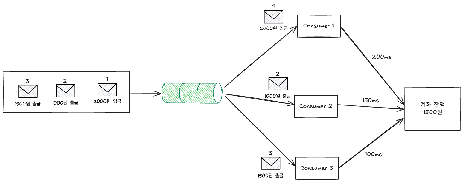 그림과 같은 상황에서 메시지가 순서대로 처리되면 문제가 없지만 Consumer간의 처리속도 차이로 인해 2, 3번 메시지가 먼저 처리되면 계좌 잔액이 0원 미만일 수 없다는 무결성에 문제가 발생해 메시지가 제대로 처리되지 못할 것입니다.