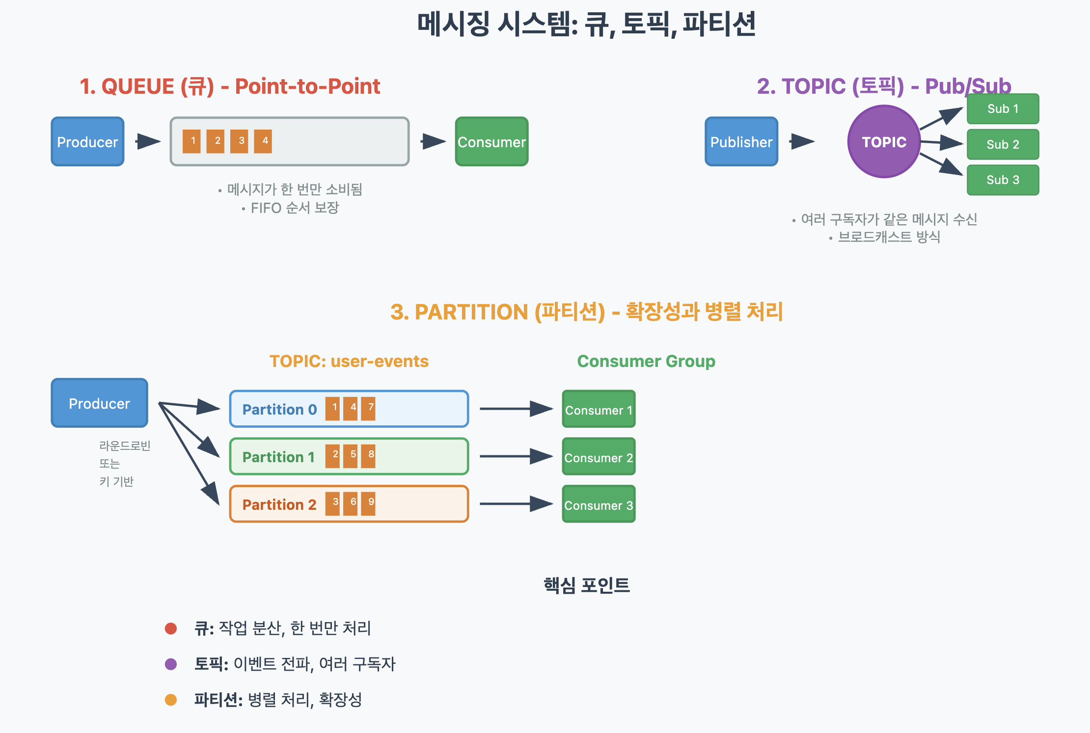 메시징 시스템은 세 가지 주요 패턴을 가지고 있습니다.
