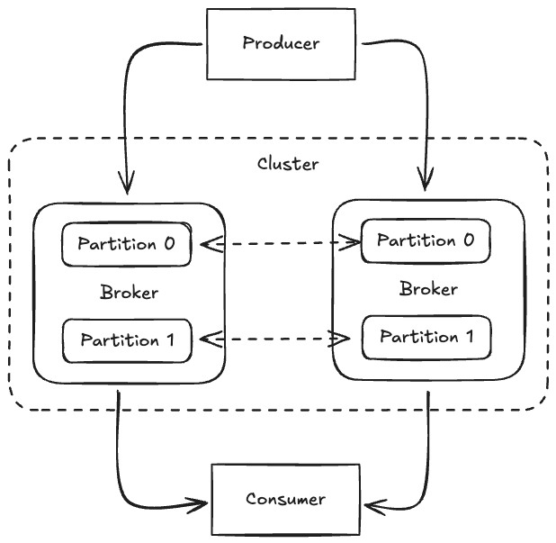 - Partitioned Log: 토픽이 여러 파티션으로 분할되어 있으며 각 파티션은 순서가 보장된 추가 전용 로그입니다. 이를 통해 수평 확장과 높은 읽기/쓰기 처리량을 실현시킵니다.