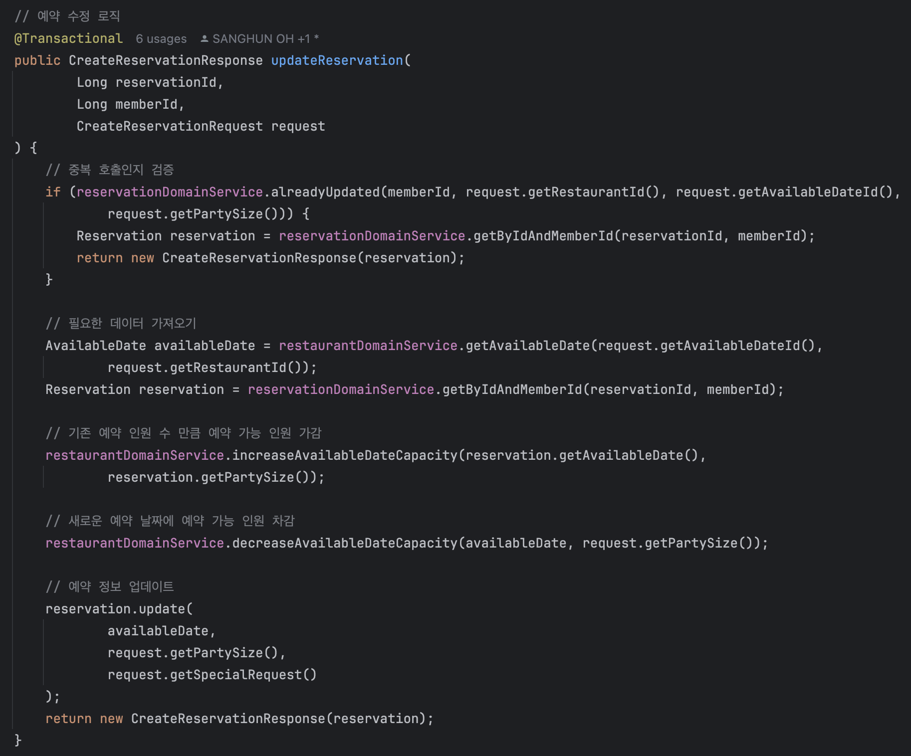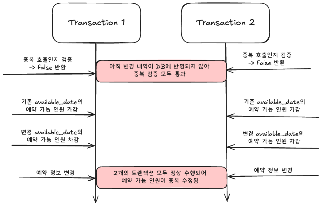 Unique 제약 조건과 더티 체킹을 제거하여 예약을 생성하는 로직에서 동시성을 제어하는 것은 성공했습니다. 하지만 예약을 수정할 때는 이미 생성된 예약이므로 Unique 제약 조건을 사용할 수 없어 한 사람이 동시에 여러 번 같은 요청을 보낼 경우(중복 API 호출) 동시성 제어가 이뤄지지 않아 예약 가능 인원 수가 중복 감소되거나 중복 증가되는 문제가 발생했습니다.