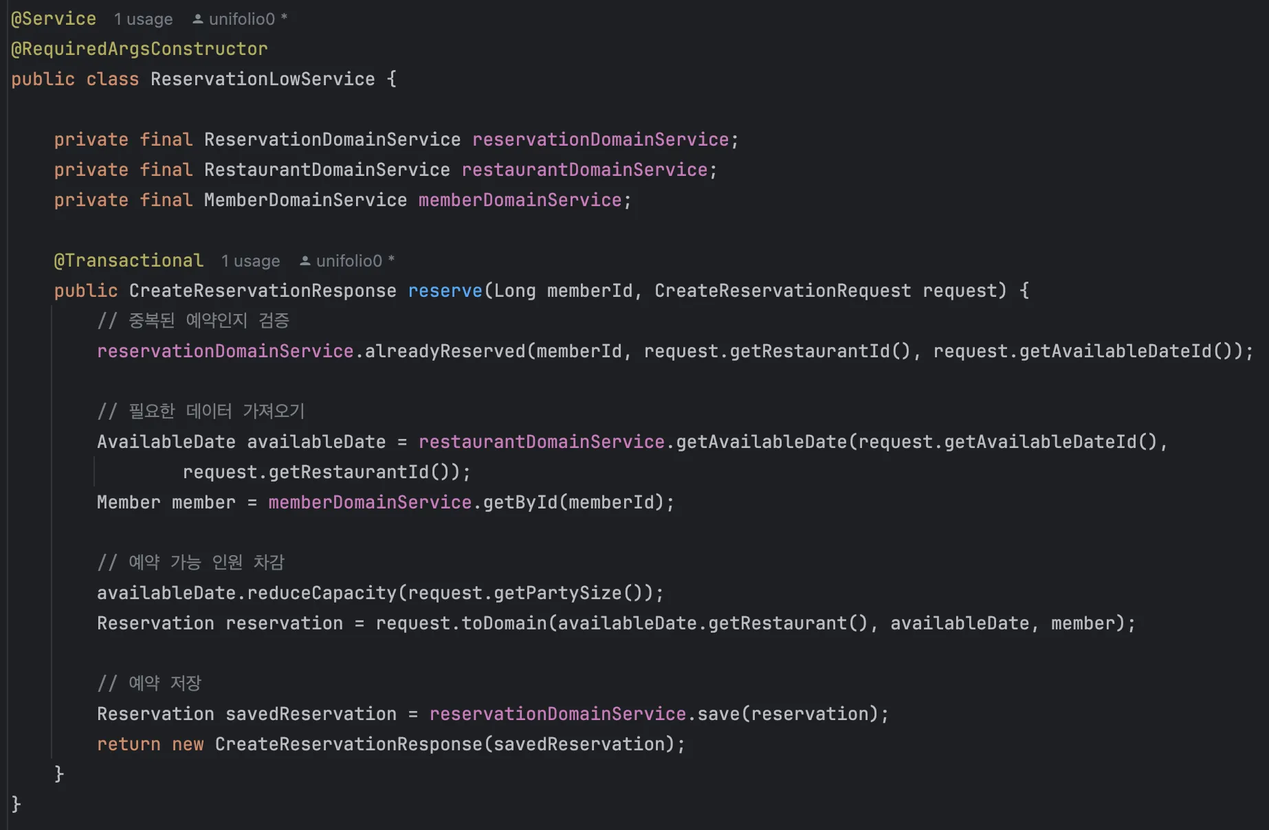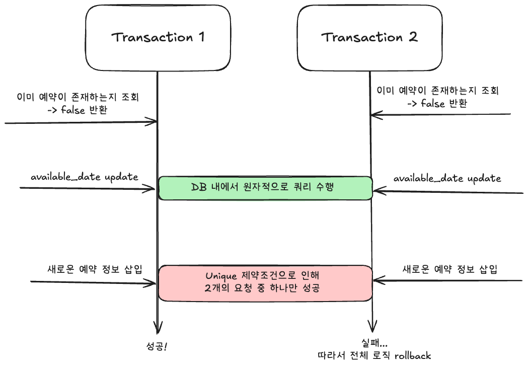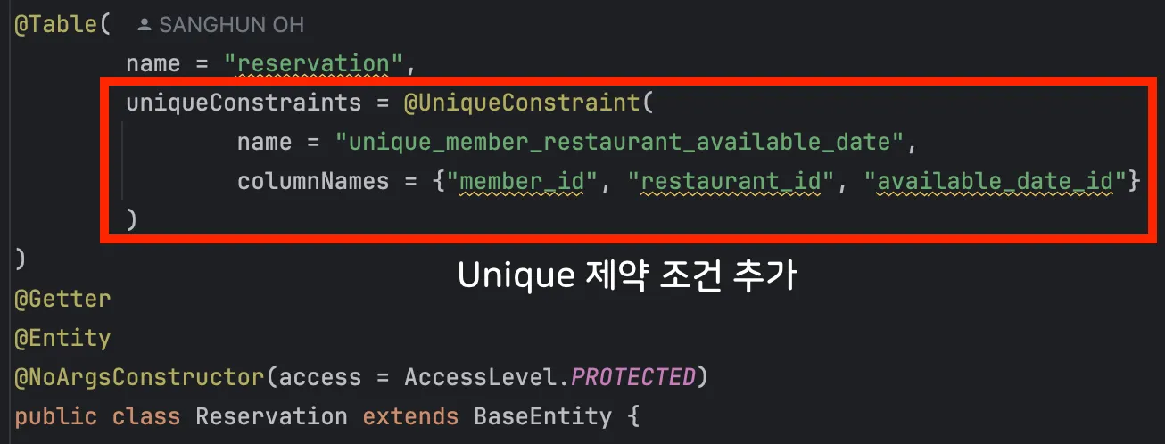 또한 reservation 테이블에 Unique 제약 조건을 추가하여 예약이 중복 생성되는 상황을 데이터베이스 수준에서 제어했습니다.