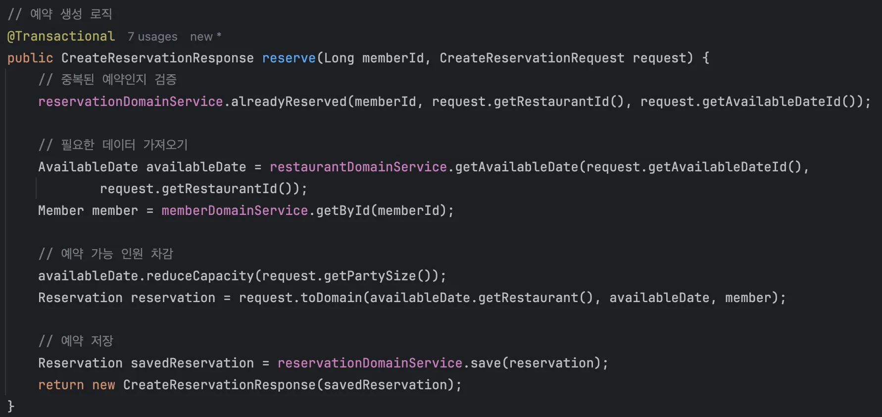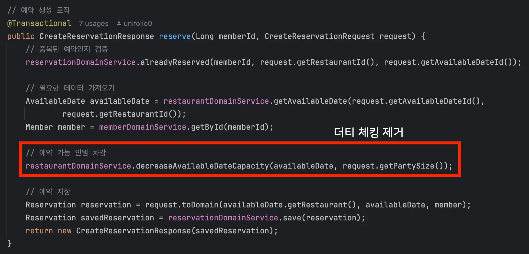 reserve메소드에는 @Transactional이 걸려있습니다. 이때 INSERT나 UPDATE 같이 쓰기 지연을 활용하는 경우에는 메소드의 순서대로 쿼리가 나가지 않습니다. 실제로 JPA의 쿼리를 확인해보면 INSERT → UPDATE 순으로 쿼리가 나가는 것을 확인할 수 있습니다.