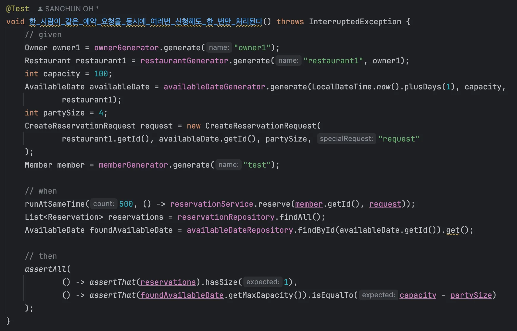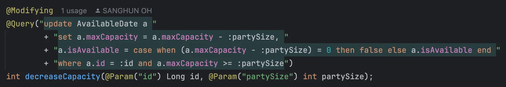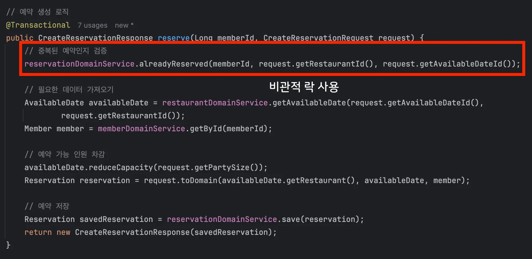 다만, 비관적 락을 사용하게 되면 reserve 메소드가 진행될 동안 조건절에 추가한 Member, AvailableDate, Restaurant의 레코드에 락이 걸려 다른 트랜잭션에서 해당 레코드에 쓰기 작업을 할 수 없습니다.
