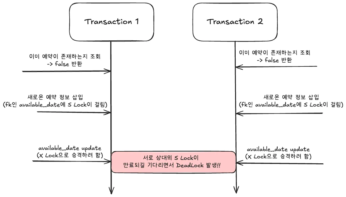 그렇기에 INSERT 문이 먼저 나가면서 FK로 있는 AvailableDate에 S Lock이 걸립니다. S Lock은 다중 트랜잭션 간 동시 획득이 가능합니다. 그 뒤 두 트랜잭션에서 S Lock이 걸린 AvailableDate에 UPDATE 문이 나가면서 X Lock 획득을 위해 대기하는 과정에서 락 경합이 발생하여 DeadLock이 발생합니다.