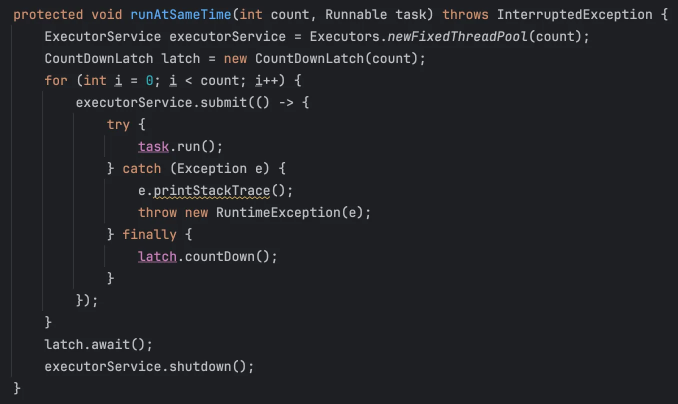 직접 작성한 테스트 코드로 동시에 여러 개의 요청이 들어오는 상황을 시뮬레이션한 결과, DeadLock이 발생했습니다.