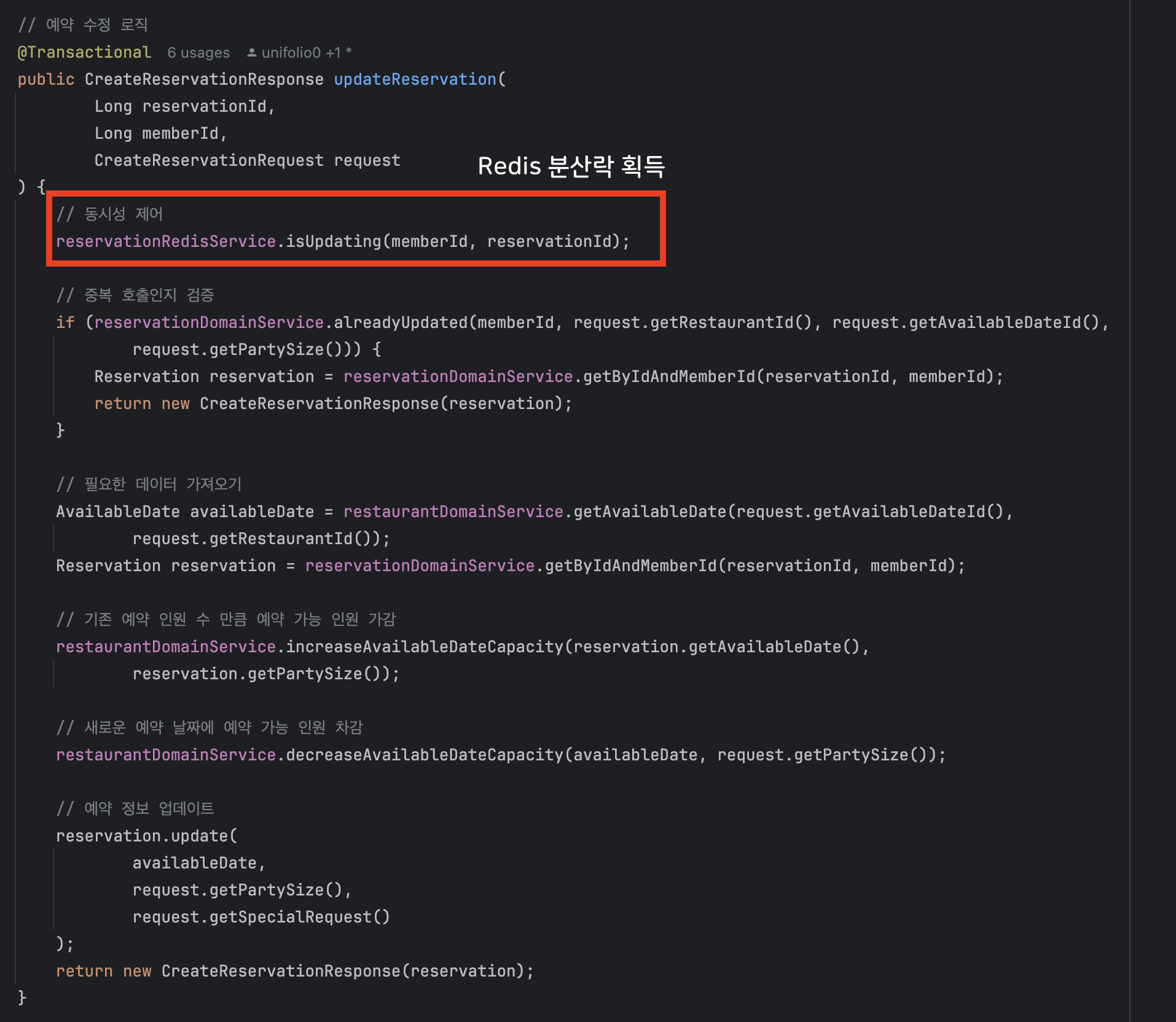 Redis 분산락을 활용하여 동시성을 제어한 코드입니다. 이때 Named Lock과 달리 하나의 트랜잭션으로 묶은 이유는 Redis는 MySQL과 별개의 DB이므로 트랜잭션에 영향을 받지 않아 하나의 트랜잭션으로 묶었습니다.