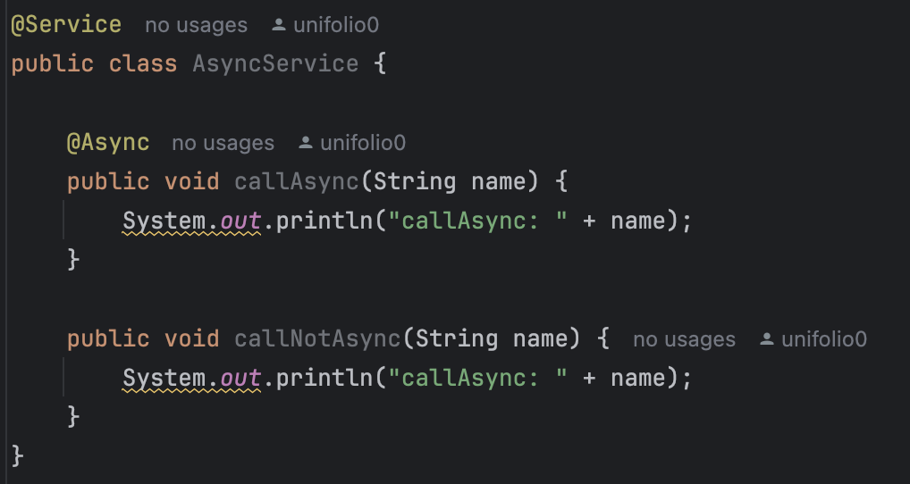 중요한 점은, 같은 클래스 내부에서 @Async 메소드를 직접 호출하면 프록시를 거치지 않기 때문에 비동기로 동작하지 않습니다.