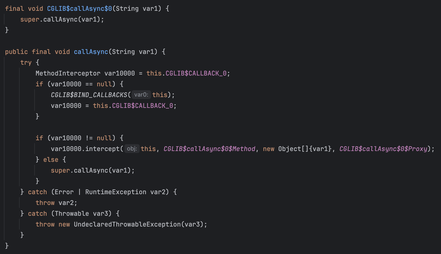 asyncService는 실제로는 AsyncService$$SpringCGLIB$$0 프록시 객체이므로, 프록시의 callAsync 메서드가 호출됩니다. 아래는 실제 프록시 객체의 코드입니다.