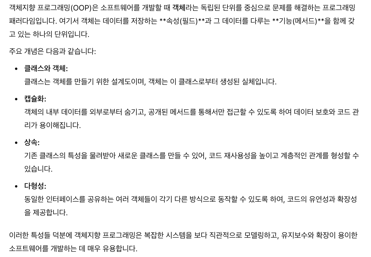 그럼 대체 객체지향이란 무엇일까요? 아래는 gpt가 객체지향 프로그래밍이 뭐야?라는 질문에 대해 답변한 내용입니다.
